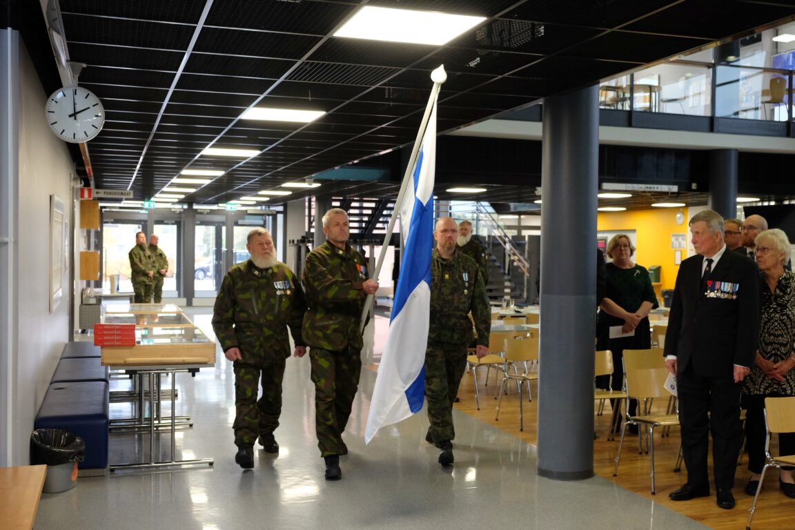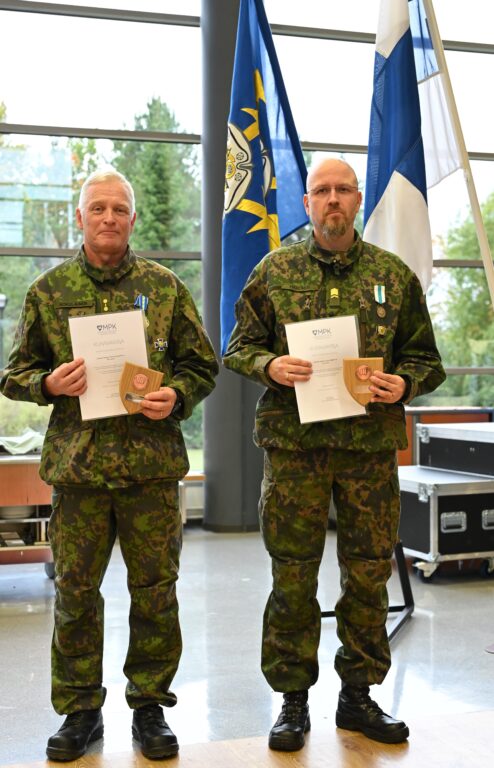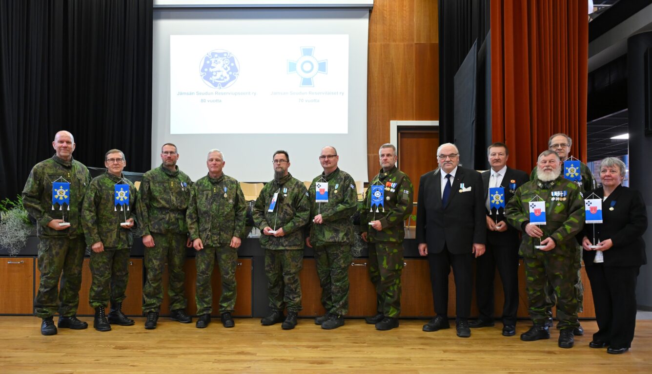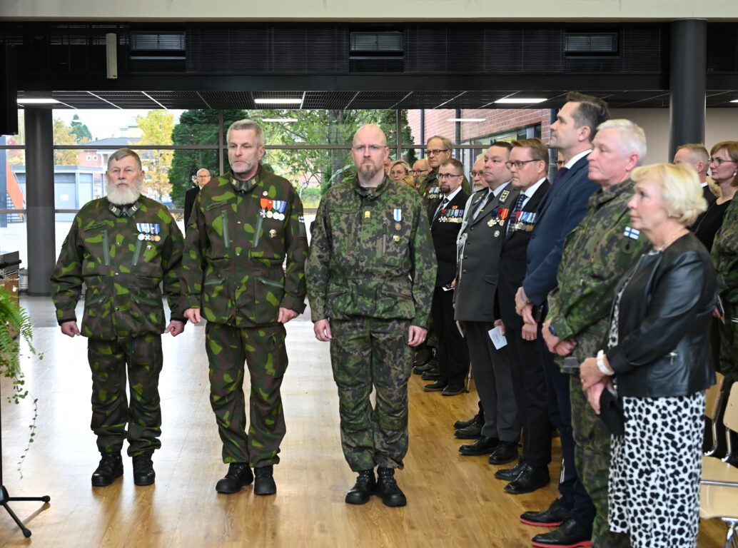 Molempien yhdistysten puheenjohtajat ottivat vastaan Hämeen maanpuolustuspiirin päällikön yhdistyksille myöntämän Maanpuolustuskoulutuksen plaketin vaakuna-alustalla.
