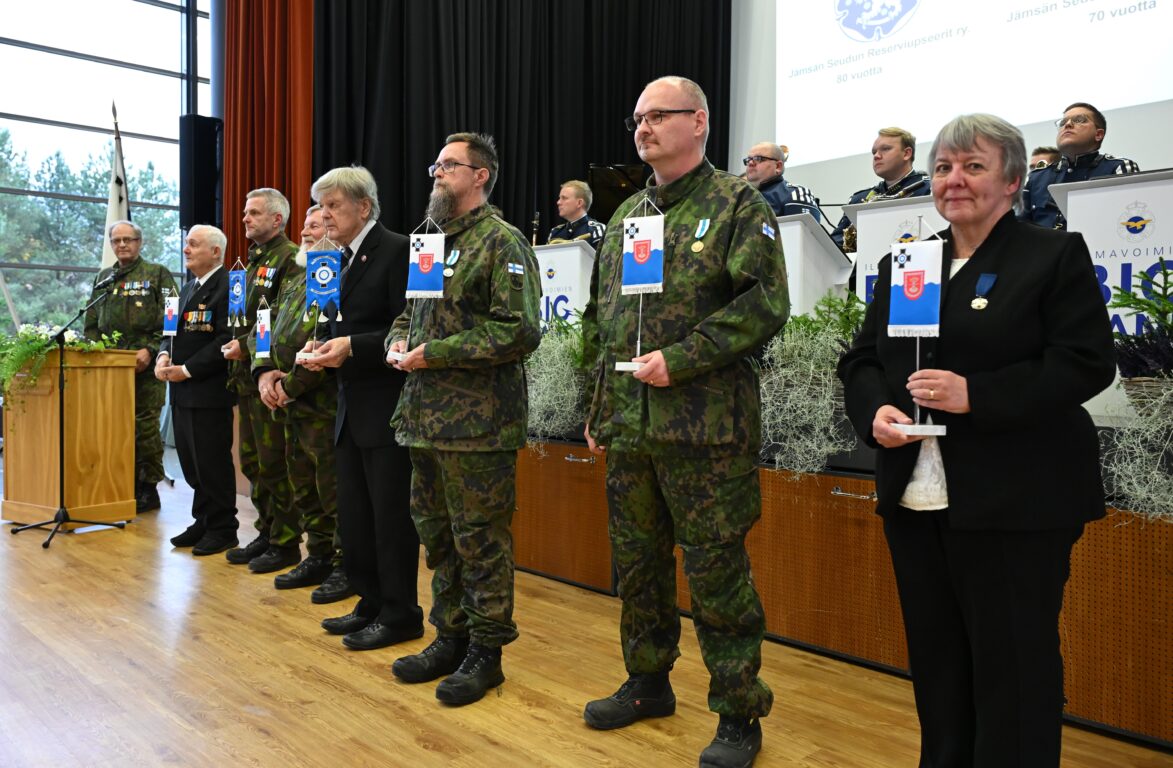 Kuvassa molempien yhdistysten paikalla olleet ansiomitalien ja standaarien saajat.